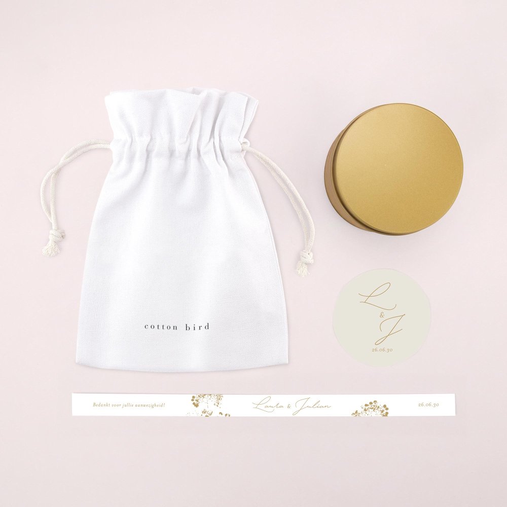 Het elegante gouden doosje kan je zelf personaliseren met de namen van het bruidspaar, de datum van het huwelijk, en een persoonlijke tekst.