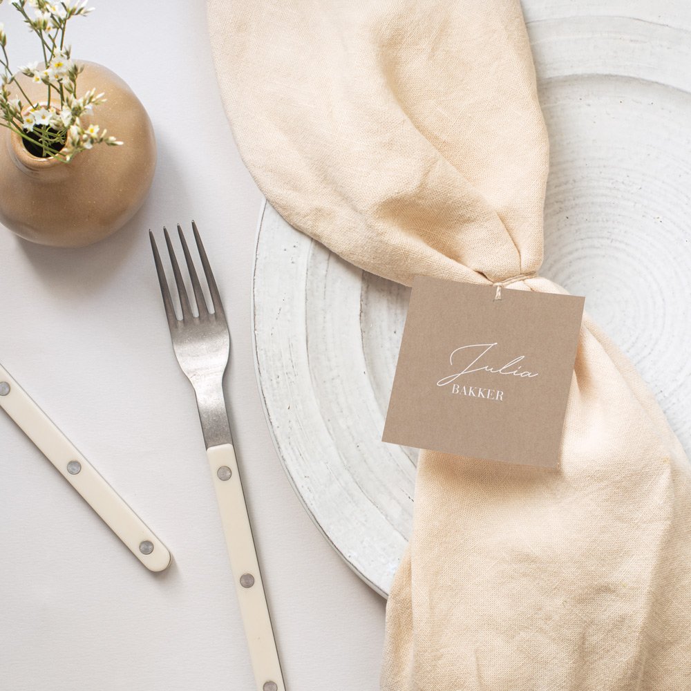 Bind de kaartjes met een juten koord aan de menukaart en schuif het geheel in een mooie servet zodat jullie gasten makkelijk hun plaats vinden. Bonus: een prachtige aangeklede tafel.