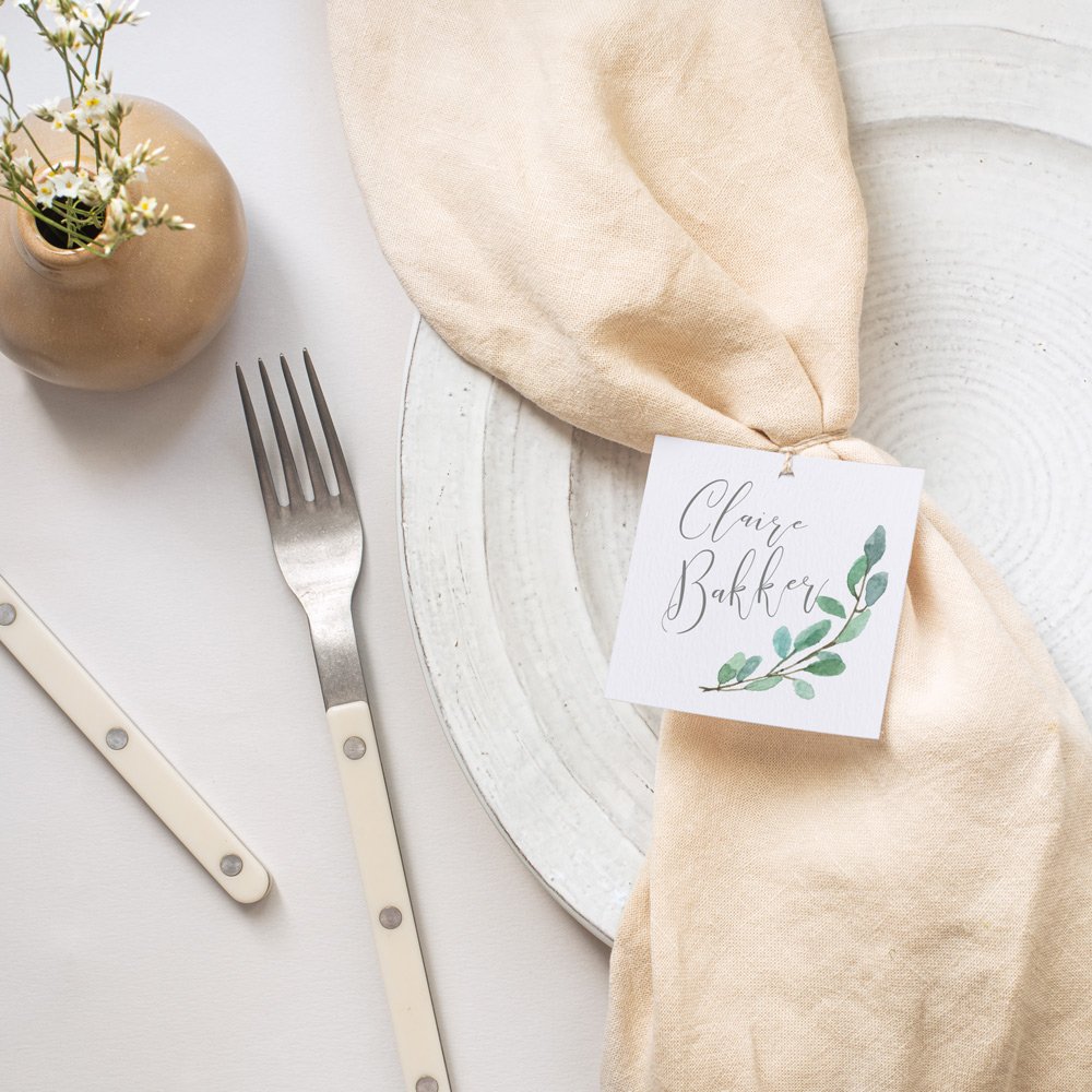 Bind de kaartjes met een juten koord aan de menukaart en schuif het geheel in een mooie servet zodat jullie gasten makkelijk hun plaats vinden. Bonus: een prachtige aangeklede tafel.