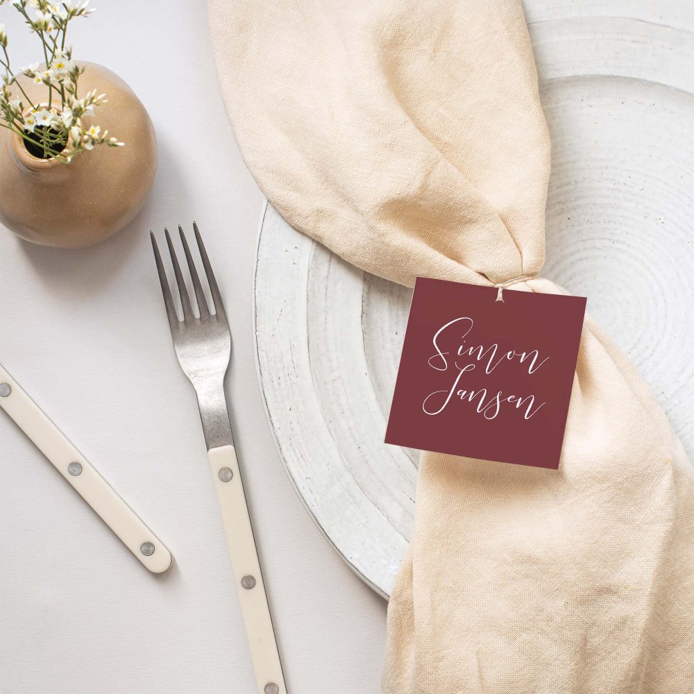 Bind de kaartjes met een juten koord aan de menukaart en schuif het geheel in een mooie servet zodat jullie gasten makkelijk hun plaats vinden. Bonus: een prachtige aangeklede tafel.