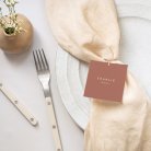 Bind de kaartjes met een juten koord aan de menukaart en schuif het geheel in een mooie servet zodat jullie gasten makkelijk hun plaats vinden. Bonus: een prachtige aangeklede tafel.