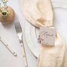 Bind de kaartjes met een juten koord aan de menukaart en schuif het geheel in een mooie servet zodat jullie gasten makkelijk hun plaats vinden. Bonus: een prachtige aangeklede tafel.