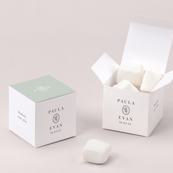 Een verrassingsdoosje als cadeautje voor je familie en vrienden, een mooie herinnering aan jullie bruiloft. Een kleine kubus van 5,4 x 5,4 cm waarin verschillende soorten lekkernijen kunnen. Laat je creativiteit de vrije loop!