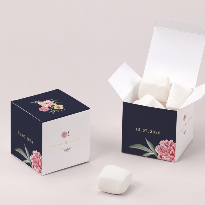 Een verrassingsdoosje als cadeautje voor je familie en vrienden, een mooie herinnering aan jullie bruiloft. Een kleine kubus van 5,4 x 5,4 cm waarin verschillende soorten lekkernijen kunnen. Laat je creativiteit de vrije loop!