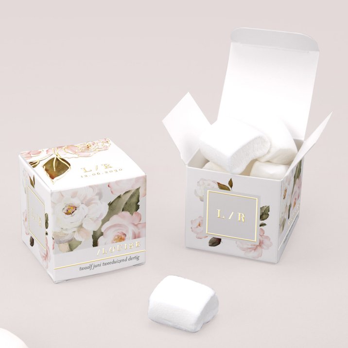 Een verrassingsdoosje als cadeautje voor je familie en vrienden, een mooie herinnering aan jullie bruiloft. Een kleine kubus van 5,4 x 5,4 cm waarin verschillende soorten lekkernijen kunnen. Laat je creativiteit de vrije loop!