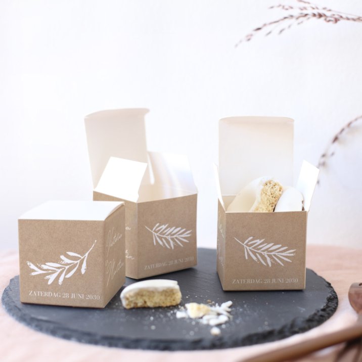 Een verrassingsdoosje als cadeautje voor je familie en vrienden, een mooie herinnering aan jullie bruiloft. Een kleine kubus van 5,4 x 5,4 cm waarin verschillende soorten lekkernijen kunnen. Laat je creativiteit de vrije loop!
