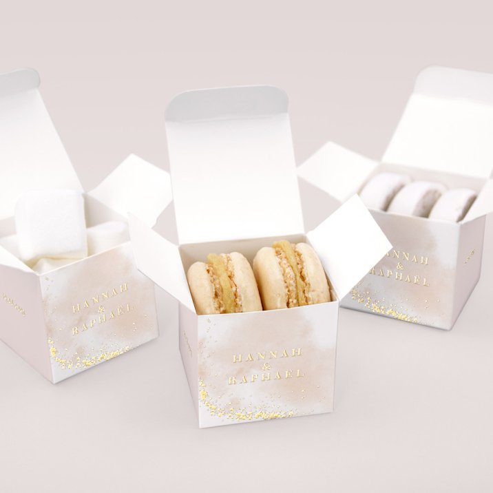 Een verrassingsdoosje als cadeautje voor je familie en vrienden, een mooie herinnering aan jullie bruiloft. Een kleine kubus van 5,4 x 5,4 cm waarin verschillende soorten lekkernijen kunnen. Laat je creativiteit de vrije loop!