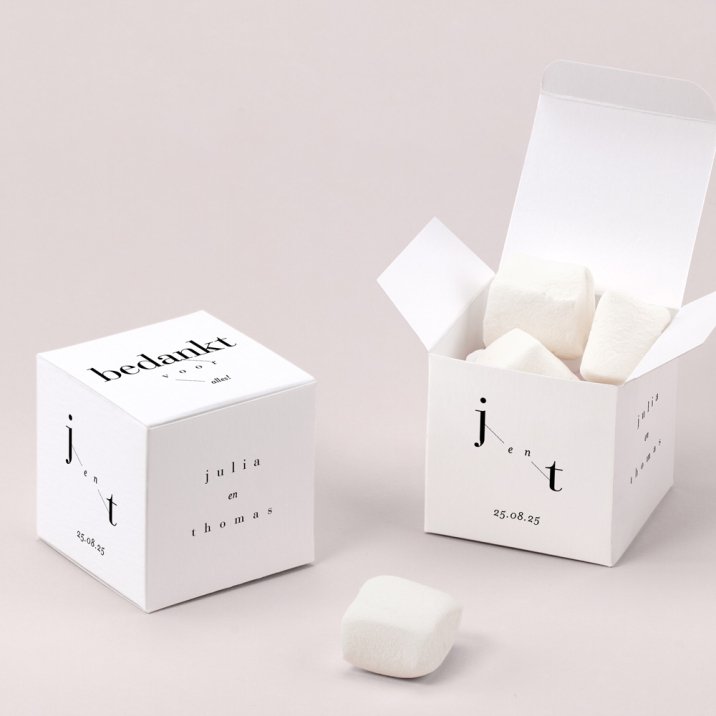 Een mooi, gepersonaliseerd doosje in de stijl van je trouwkaart. De perfecte grootte voor macarons of andere kleine snoepjes. Plaats de doosjes op de tafels tijdens het diner en bedank je gasten voor hun aanwezigheid op een originele manier.
