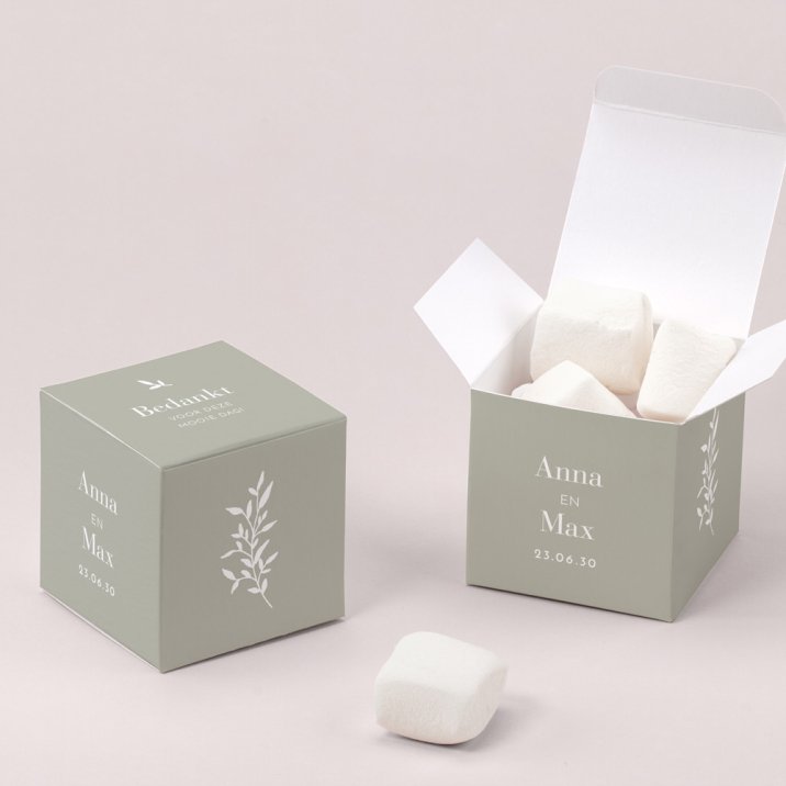 Een verrassingsdoosje als cadeautje voor je familie en vrienden, een mooie herinnering aan jullie bruiloft. Een kleine kubus van 5,4 x 5,4 cm waarin verschillende soorten lekkernijen kunnen. Laat je creativiteit de vrije loop!