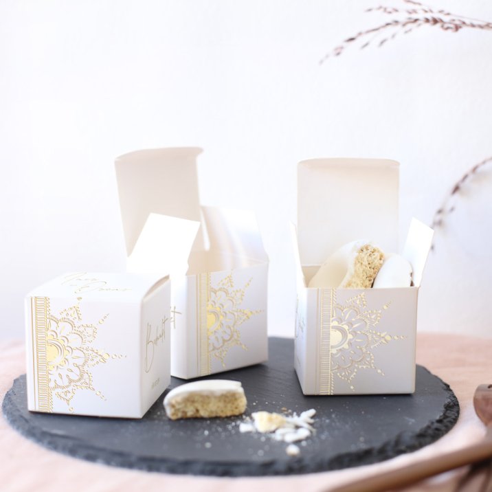 Een verrassingsdoosje als cadeautje voor je familie en vrienden, een mooie herinnering aan jullie bruiloft. Een kleine kubus van 5,4 x 5,4 cm waarin verschillende soorten lekkernijen kunnen. Laat je creativiteit de vrije loop!