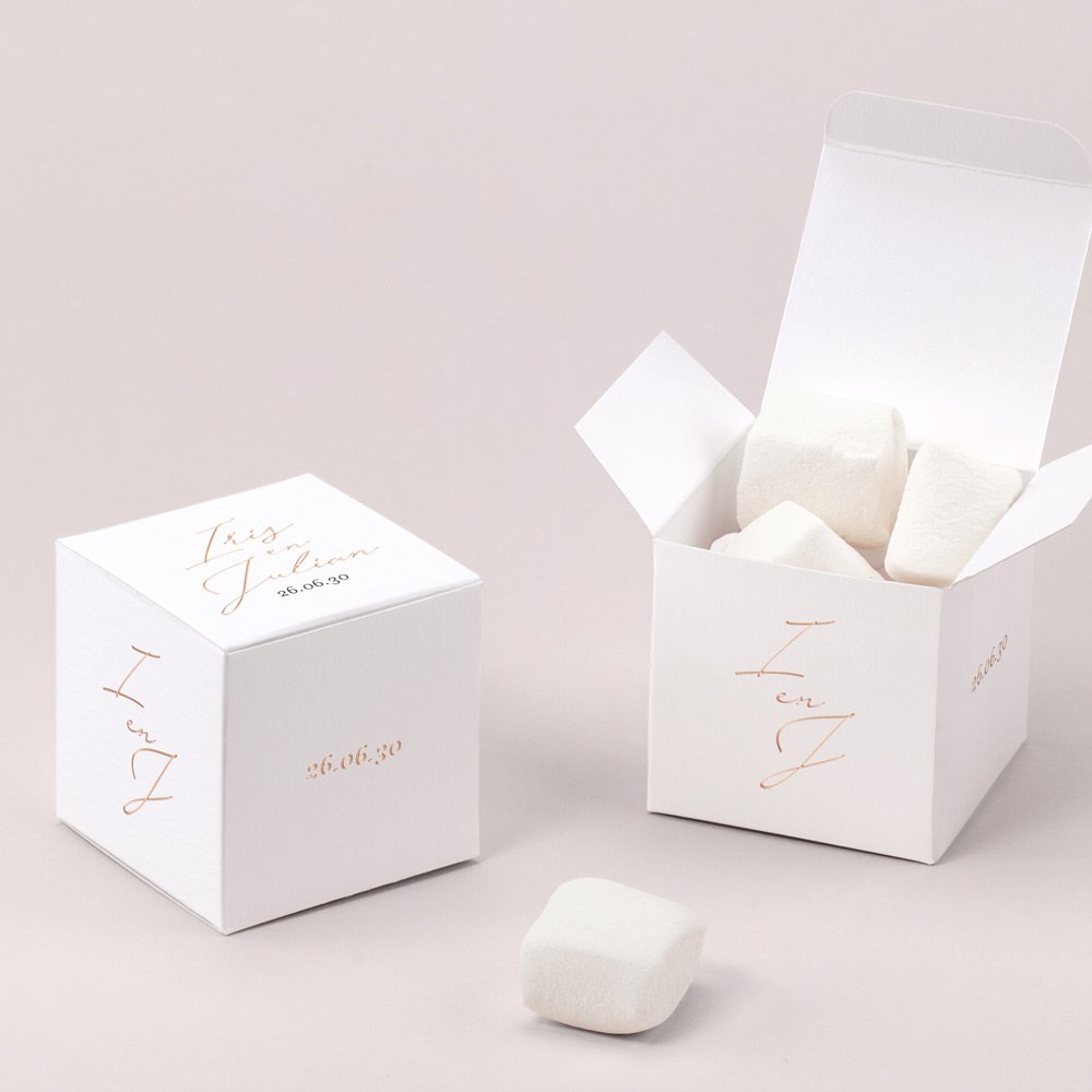 Een verrassingsdoosje als cadeautje voor je familie en vrienden, een mooie herinnering aan jullie bruiloft. Een kleine kubus van 5,4 x 5,4 cm waarin verschillende soorten lekkernijen kunnen. Laat je creativiteit de vrije loop!