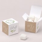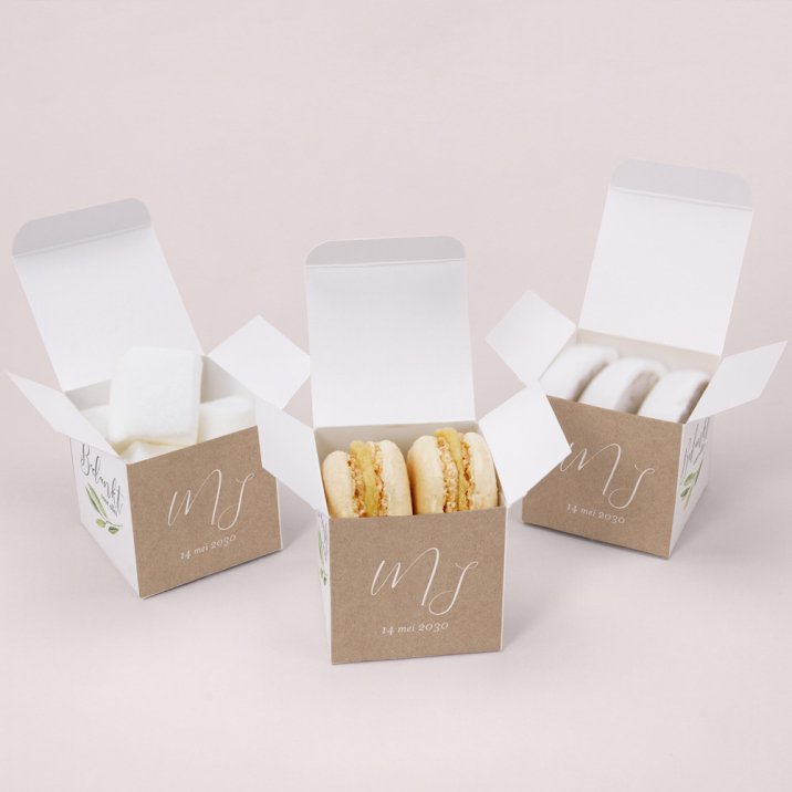 Een verrassingsdoosje als cadeautje voor je familie en vrienden, een mooie herinnering aan jullie bruiloft. Een kleine kubus van 5,4 x 5,4 cm waarin verschillende soorten lekkernijen kunnen. Laat je creativiteit de vrije loop!