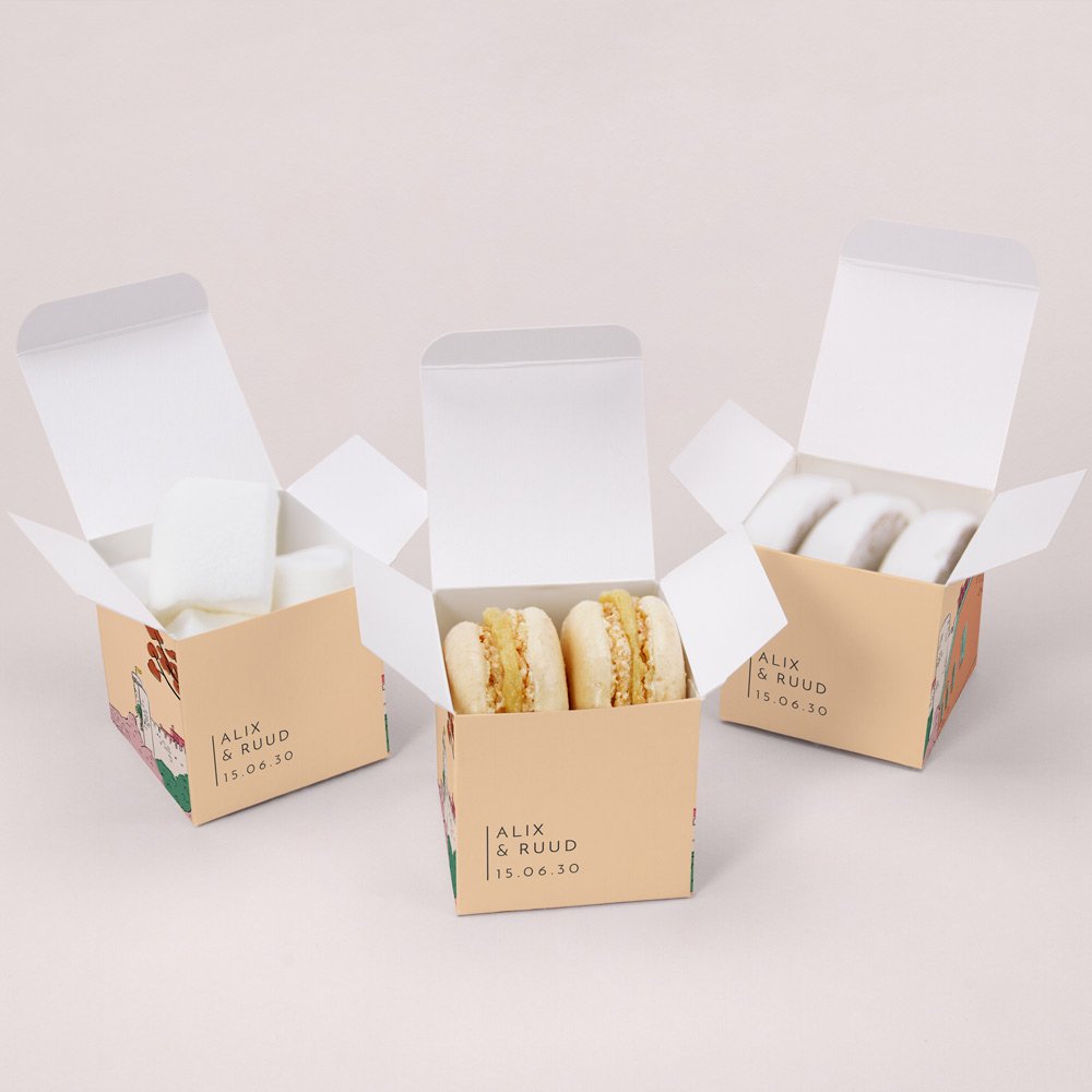 Een verrassingsdoosje als cadeautje voor je familie en vrienden, een mooie herinnering aan jullie bruiloft. Een kleine kubus van 5,4 x 5,4 cm waarin verschillende soorten lekkernijen kunnen. Laat je creativiteit de vrije loop!