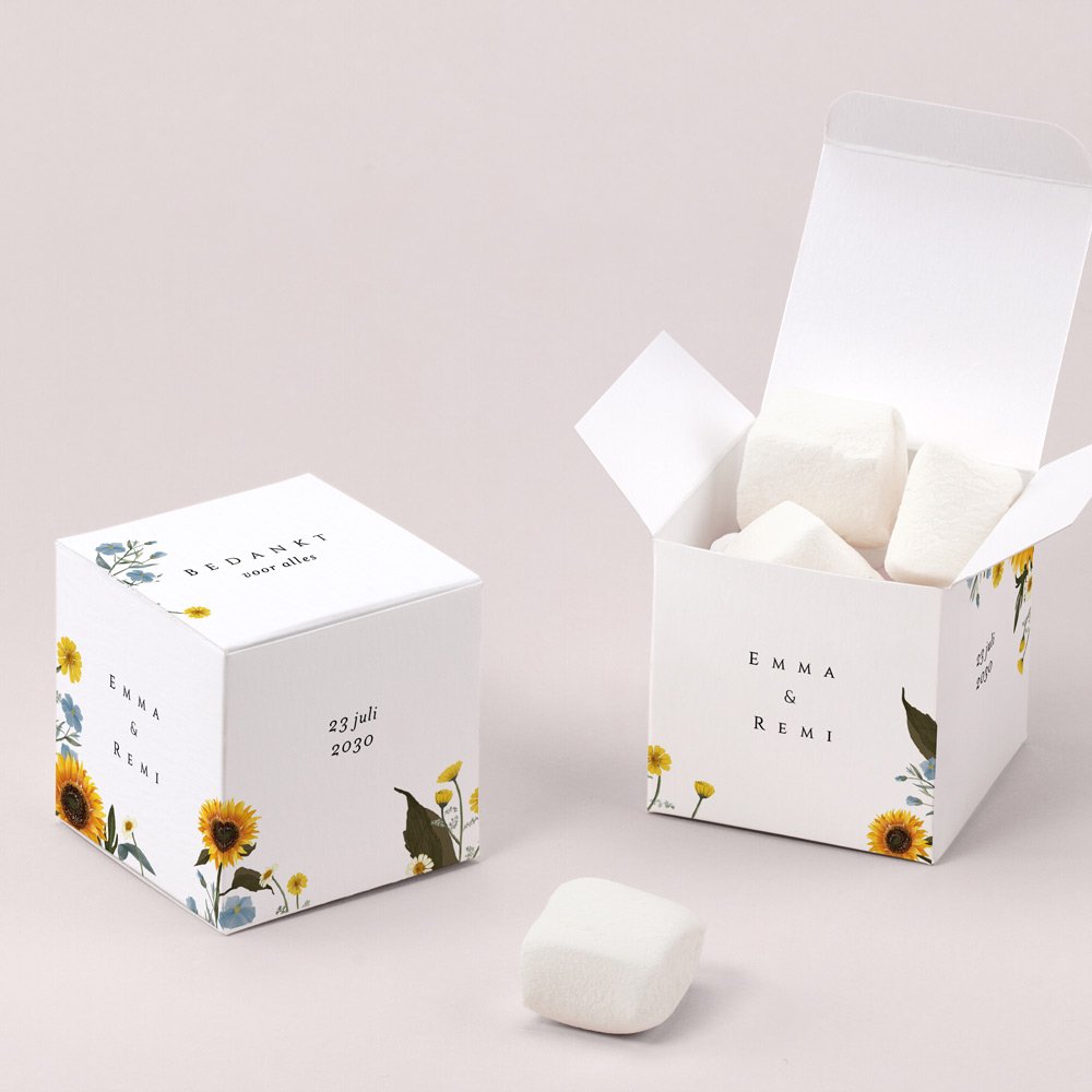 Een verrassingsdoosje als cadeautje voor je familie en vrienden, een mooie herinnering aan jullie bruiloft. Een kleine kubus van 5,4 x 5,4 cm waarin verschillende soorten lekkernijen kunnen. Laat je creativiteit de vrije loop!