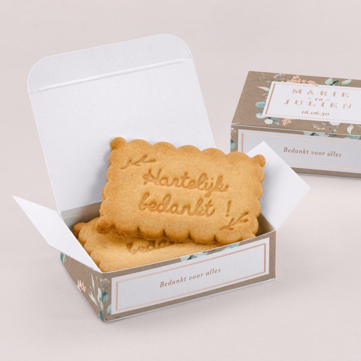 De koekjesdoos is speciaal ontworpen en gemaakt om jullie gasten te verrassen met een smakelijk cadeautje! Personaliseer het doosje met een lief berichtje, foto of jullie namen.In 1 doosje kunnen 3 of 4 koekjes, afhangend van de dikte van het koekje.
