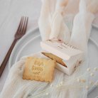 De koekjesdoos is speciaal ontworpen en gemaakt om jullie gasten te verrassen met een smakelijk cadeautje! Personaliseer het doosje met een lief berichtje, foto of jullie namen.In 1 doosje kunnen 3 of 4 koekjes, afhangend van de dikte van het koekje.