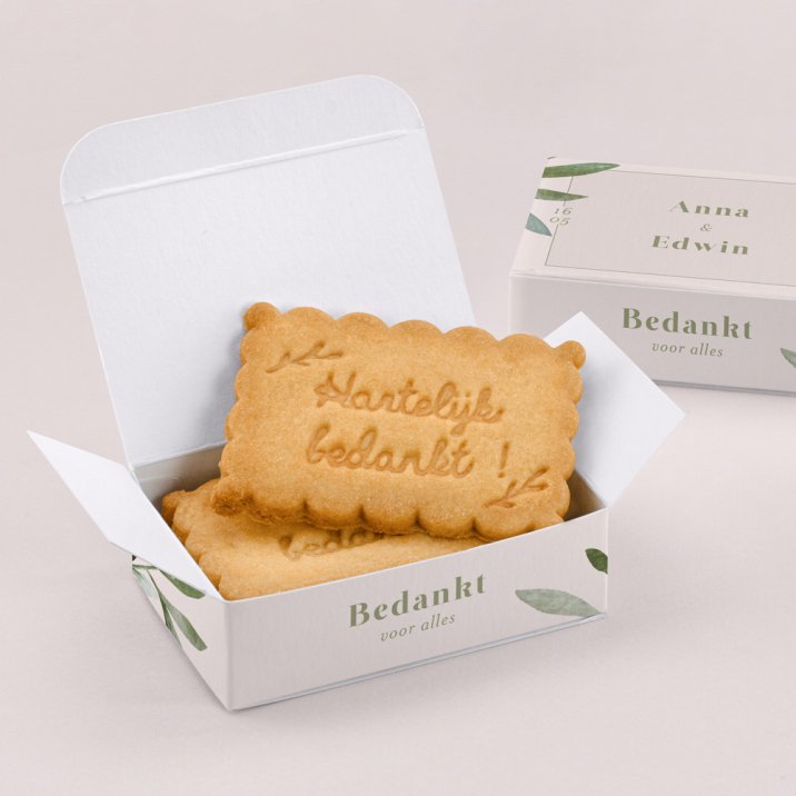 De koekjesdoos is speciaal ontworpen en gemaakt om jullie gasten te verrassen met een smakelijk cadeautje! Personaliseer het doosje met een lief berichtje, foto of jullie namen.In 1 doosje kunnen 3 of 4 koekjes, afhangend van de dikte van het koekje.