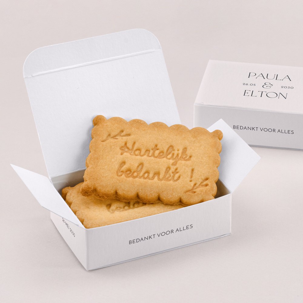 De koekjesdoos is speciaal ontworpen en gemaakt om jullie gasten te verrassen met een smakelijk cadeautje! Personaliseer het doosje met een lief berichtje, foto of jullie namen.In 1 doosje kunnen 3 of 4 koekjes, afhangend van de dikte van het koekje.
