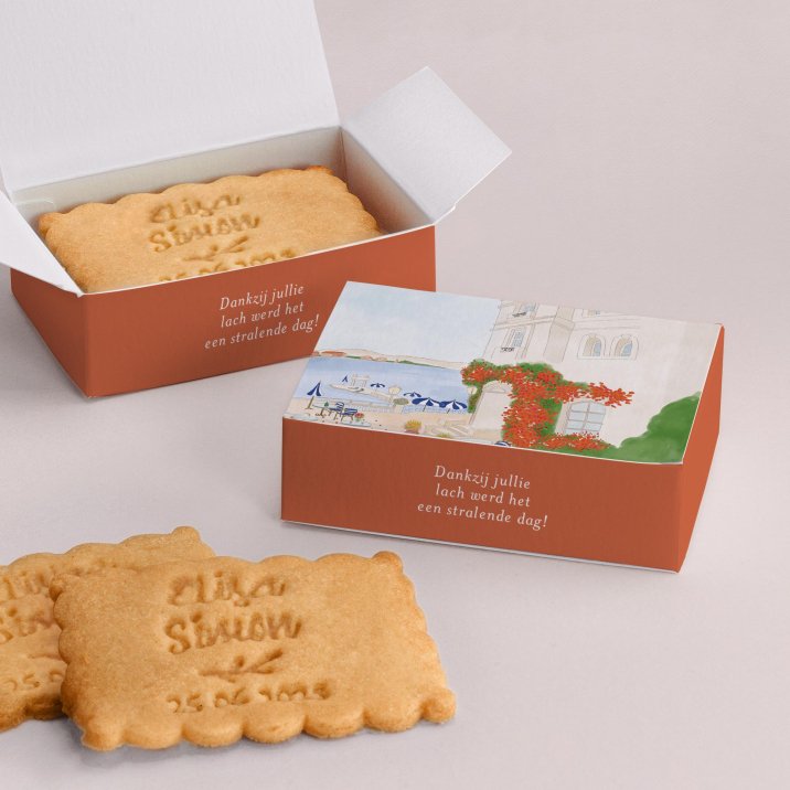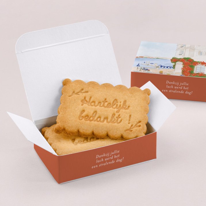 De koekjesdoos is speciaal ontworpen en gemaakt om jullie gasten te verrassen met een smakelijk cadeautje! Personaliseer het doosje met een lief berichtje, foto of jullie namen.In 1 doosje kunnen 3 of 4 koekjes, afhangend van de dikte van het koekje.