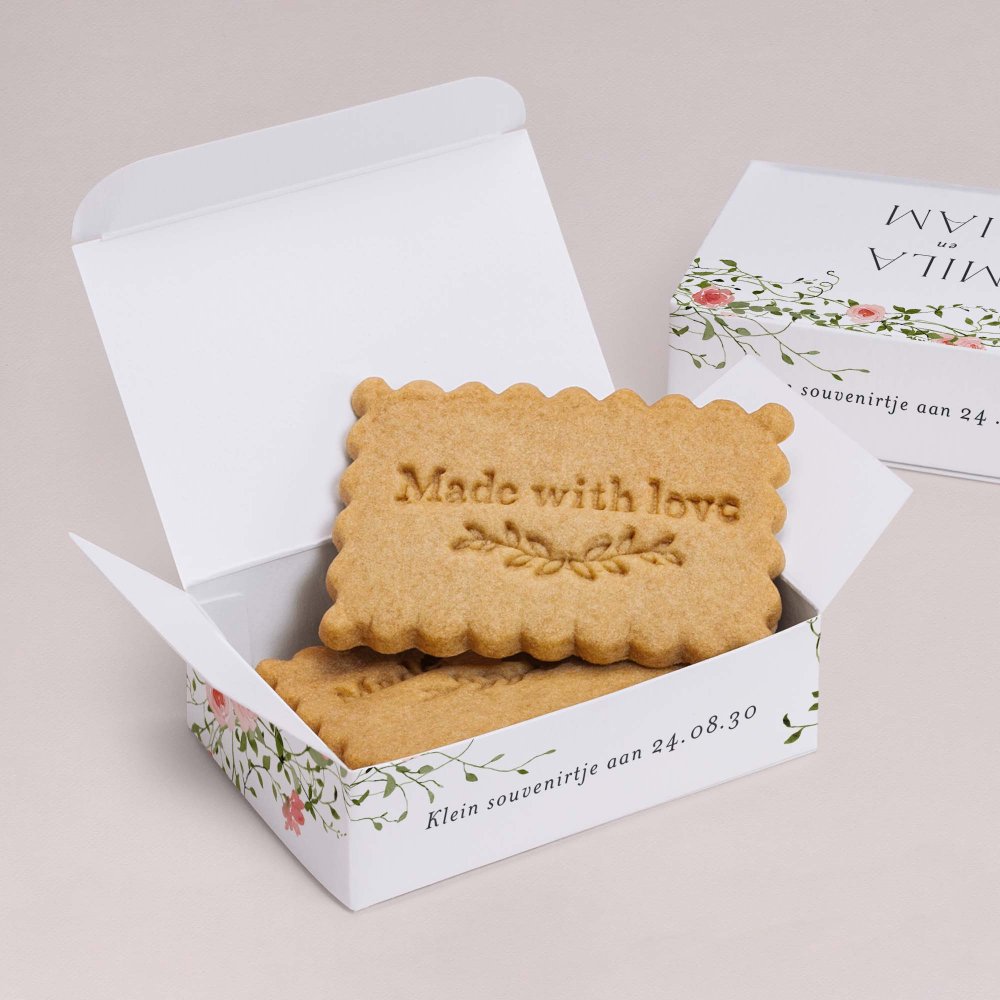 De koekjesdoos is speciaal ontworpen en gemaakt om jullie gasten te verrassen met een smakelijk cadeautje! Personaliseer het doosje met een lief berichtje, foto of jullie namen.In 1 doosje kunnen 3 of 4 koekjes, afhangend van de dikte van het koekje.