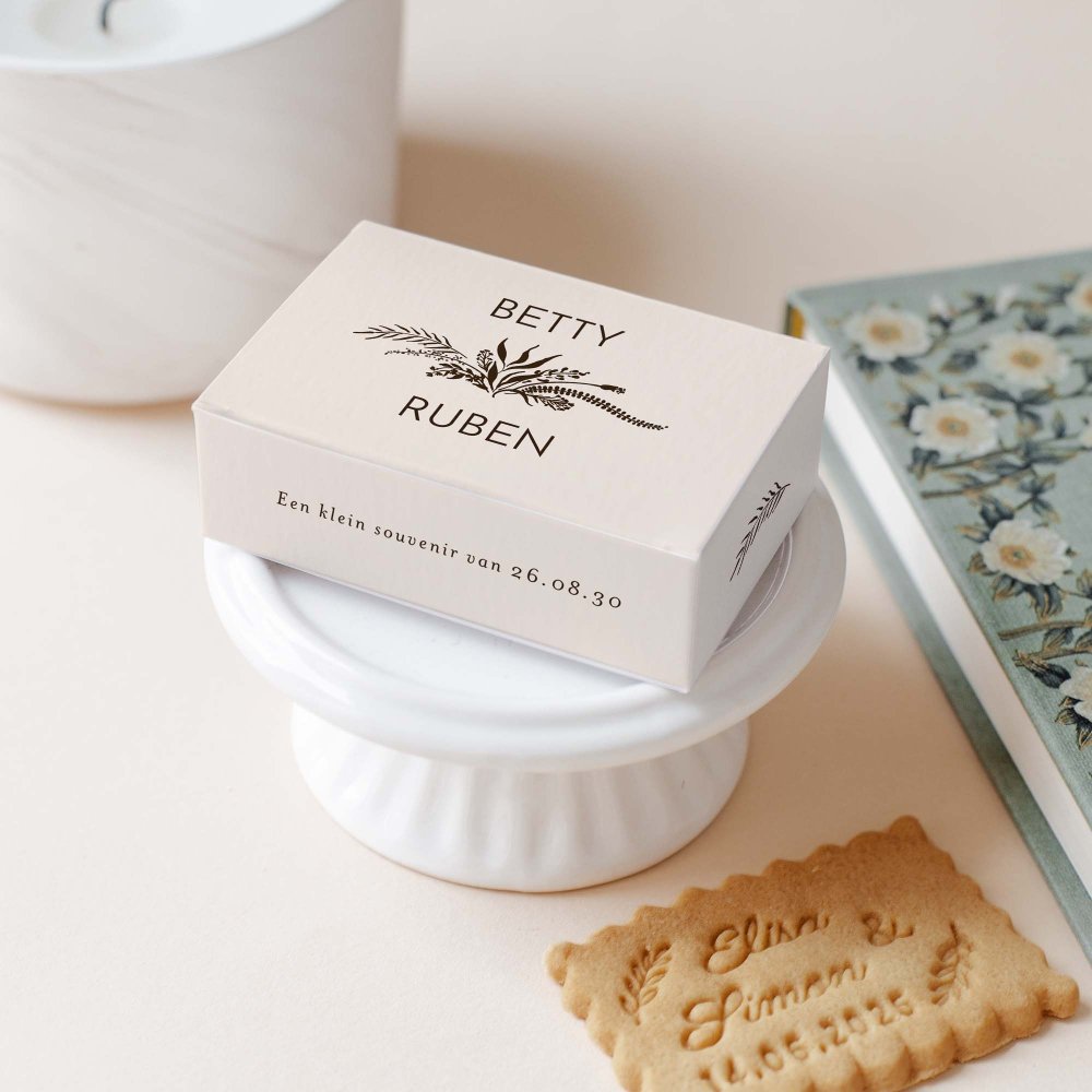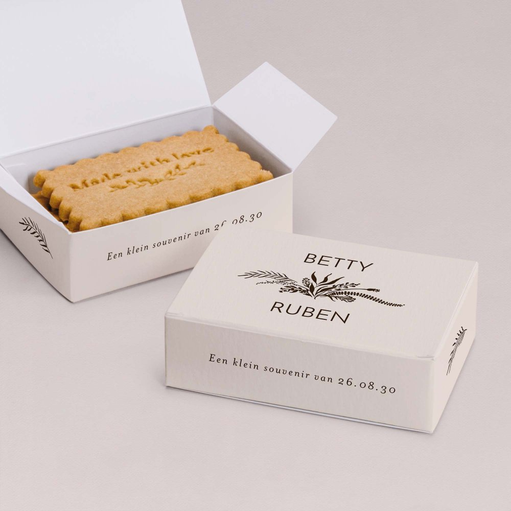 De koekjesdoos is speciaal ontworpen en gemaakt om jullie gasten te verrassen met een smakelijk cadeautje! Personaliseer het doosje met een lief berichtje, foto of jullie namen.In 1 doosje kunnen 3 of 4 koekjes, afhangend van de dikte van het koekje.