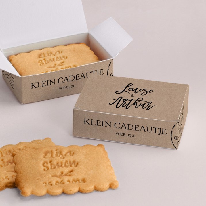 De koekjesdoos is speciaal ontworpen en gemaakt om jullie gasten te verrassen met een smakelijk cadeautje! Personaliseer het doosje met een lief berichtje, foto of jullie namen.In 1 doosje kunnen 3 of 4 koekjes, afhangend van de dikte van het koekje.