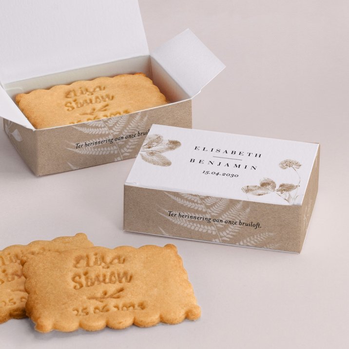De koekjesdoos is speciaal ontworpen en gemaakt om jullie gasten te verrassen met een smakelijk cadeautje! Personaliseer het doosje met een lief berichtje, foto of jullie namen.In 1 doosje kunnen 3 of 4 koekjes, afhangend van de dikte van het koekje.