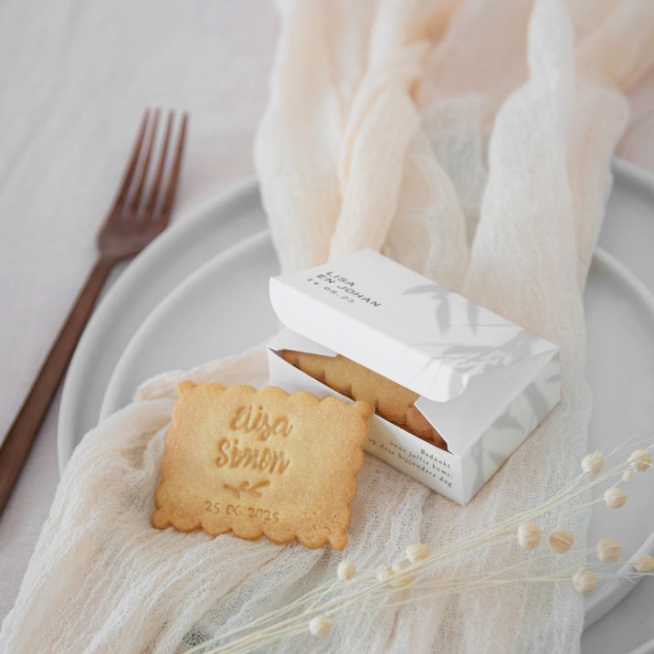 De koekjesdoos is speciaal ontworpen en gemaakt om jullie gasten te verrassen met een smakelijk cadeautje! Personaliseer het doosje met een lief berichtje, foto of jullie namen.In 1 doosje kunnen 3 of 4 koekjes, afhangend van de dikte van het koekje.