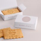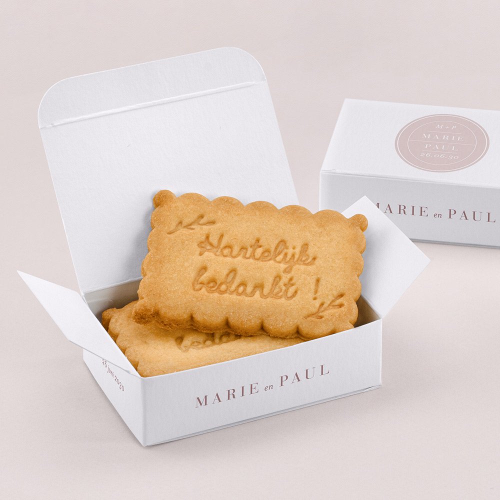 De koekjesdoos is speciaal ontworpen en gemaakt om jullie gasten te verrassen met een smakelijk cadeautje! Personaliseer het doosje met een lief berichtje, foto of jullie namen.In 1 doosje kunnen 3 of 4 koekjes, afhangend van de dikte van het koekje.