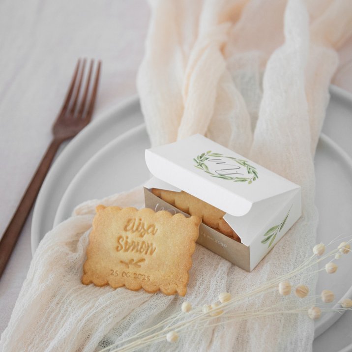 De koekjesdoos is speciaal ontworpen en gemaakt om jullie gasten te verrassen met een smakelijk cadeautje! Personaliseer het doosje met een lief berichtje, foto of jullie namen.In 1 doosje kunnen 3 of 4 koekjes, afhangend van de dikte van het koekje.