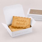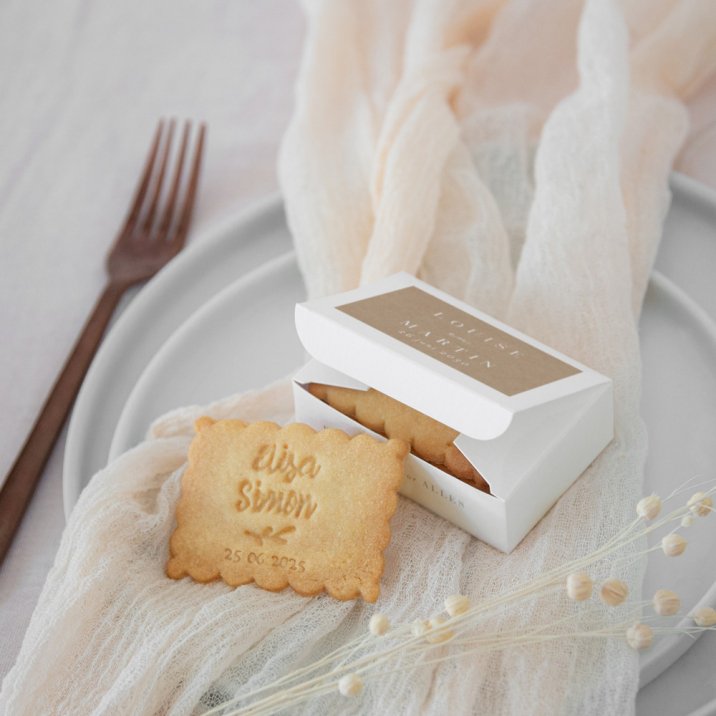 De koekjesdoos is speciaal ontworpen en gemaakt om jullie gasten te verrassen met een smakelijk cadeautje! Personaliseer het doosje met een lief berichtje, foto of jullie namen.In 1 doosje kunnen 3 of 4 koekjes, afhangend van de dikte van het koekje.