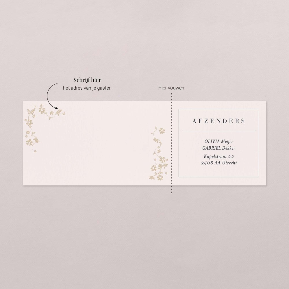 Jullie adres wordt afgedrukt op de rechterkant (dit deel komt op de achterkant van de envelop), dus je hoeft alleen de adressen van je gasten aan de linkerkant te schrijven om ze te verzenden!