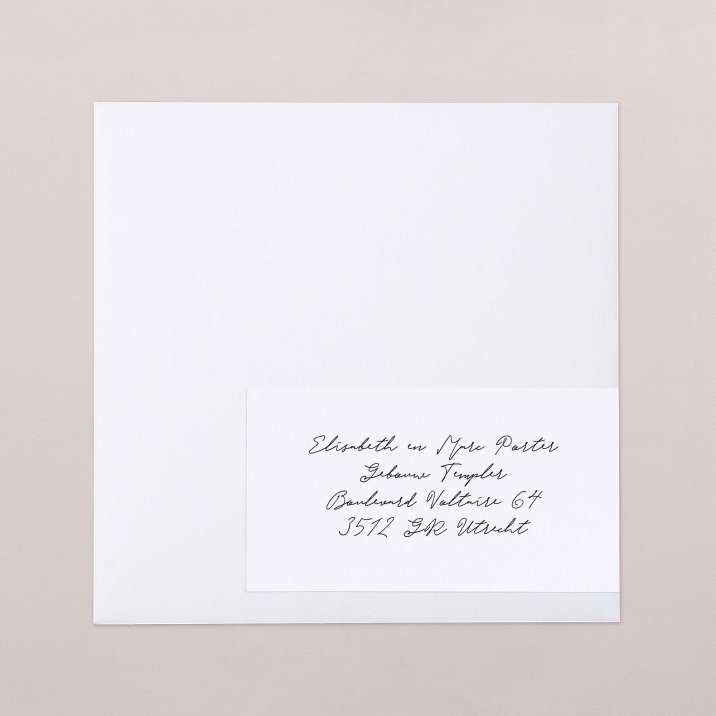 Jullie adres wordt afgedrukt op de rechterkant (dit deel komt op de achterkant van de envelop), dus je hoeft alleen de adressen van je gasten aan de linkerkant te schrijven om ze te verzenden!