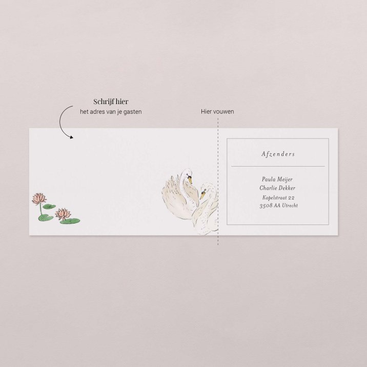Jullie adres wordt afgedrukt op de rechterkant (dit deel komt op de achterkant van de envelop), dus je hoeft alleen de adressen van je gasten aan de linkerkant te schrijven om ze te verzenden!