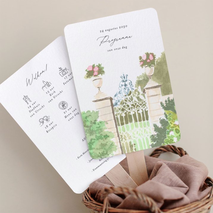 De programma waaiers zetten de toon voor de ceremonie, houden jullie gasten op de hoogte van het dagprogramma en ... zijn erg handig bij warm weer!