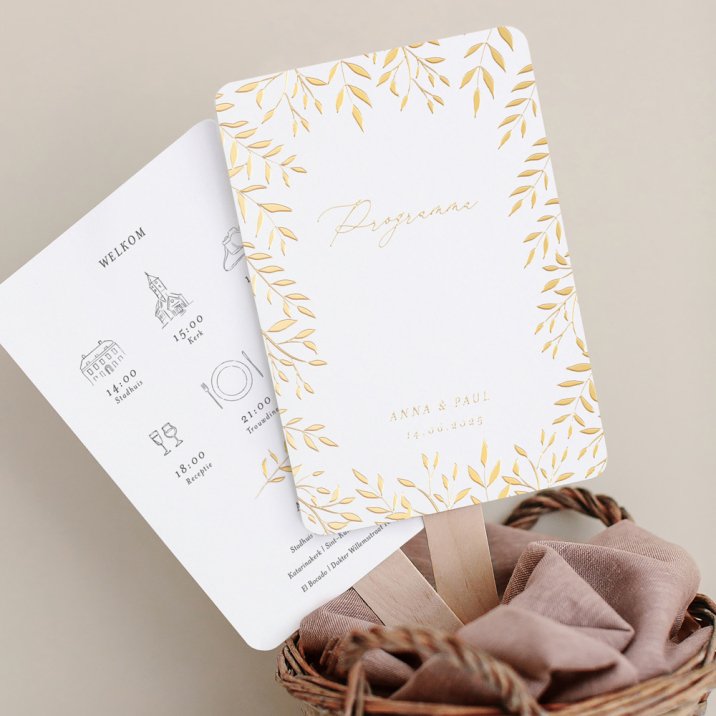 De programma waaiers zetten de toon voor de ceremonie, houden jullie gasten op de hoogte van het dagprogramma en ... zijn erg handig bij warm weer!