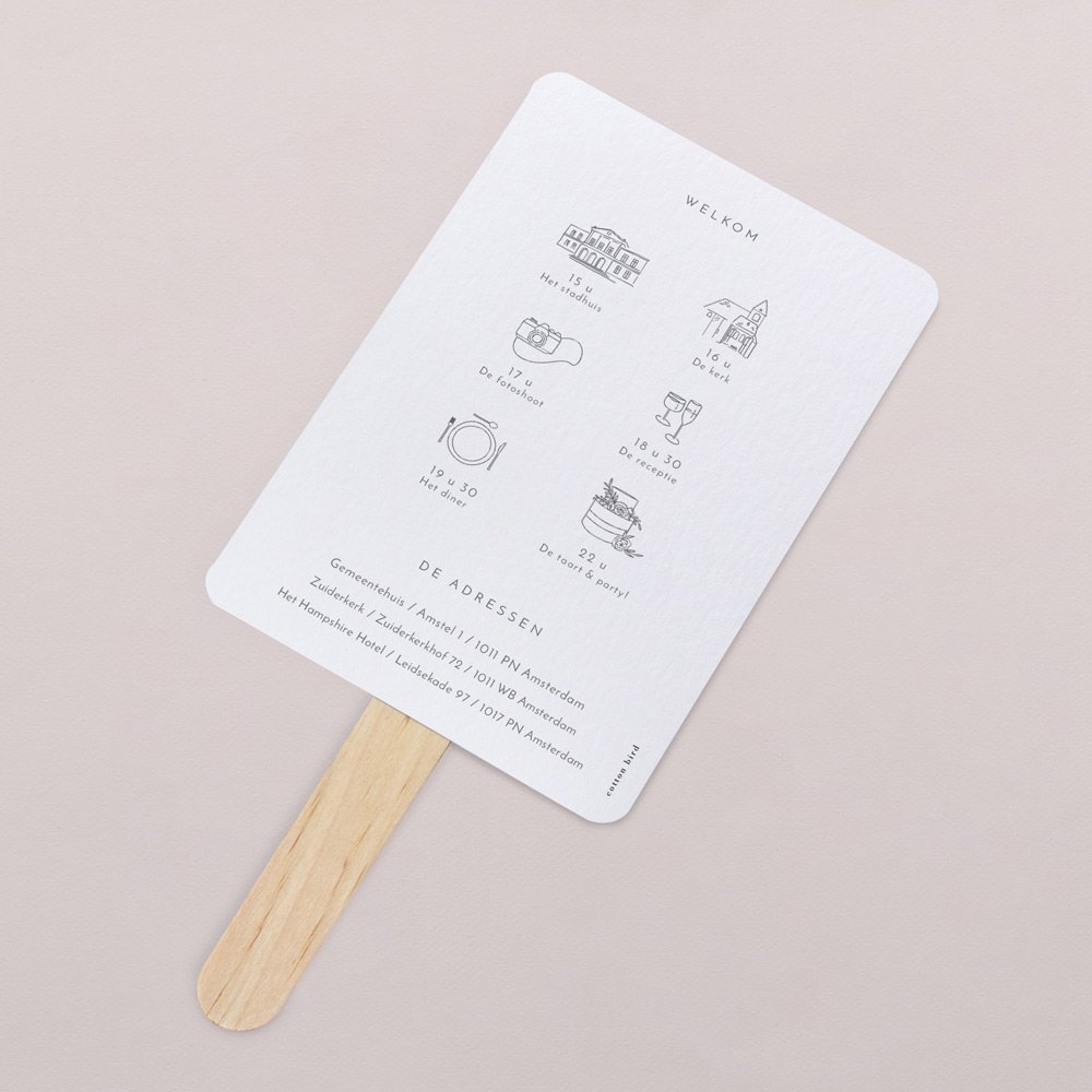 De programma waaiers zetten de toon voor de ceremonie, houden jullie gasten op de hoogte van het dagprogramma en ... zijn erg handig bij warm weer!