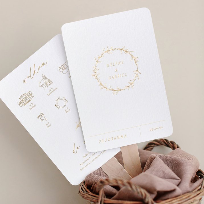 De programma waaiers zetten de toon voor de ceremonie, houden jullie gasten op de hoogte van het dagprogramma en ... zijn erg handig bij warm weer!