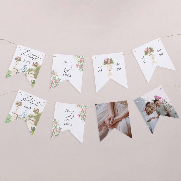 Deze slinger van 8 dubbelzijdige wimpels is te personaliseren met jullie voornamen, foto, de datum van jullie huwelijk, een klein welkomstwoord en nog veel meer.