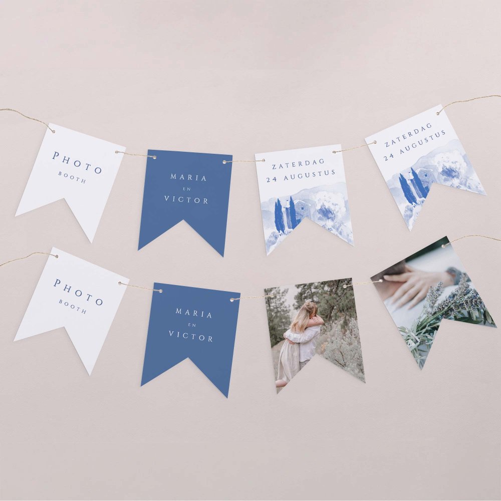 Deze slinger van 8 dubbelzijdige wimpels is te personaliseren met jullie voornamen, foto, de datum van jullie huwelijk, een klein welkomstwoord en nog veel meer.