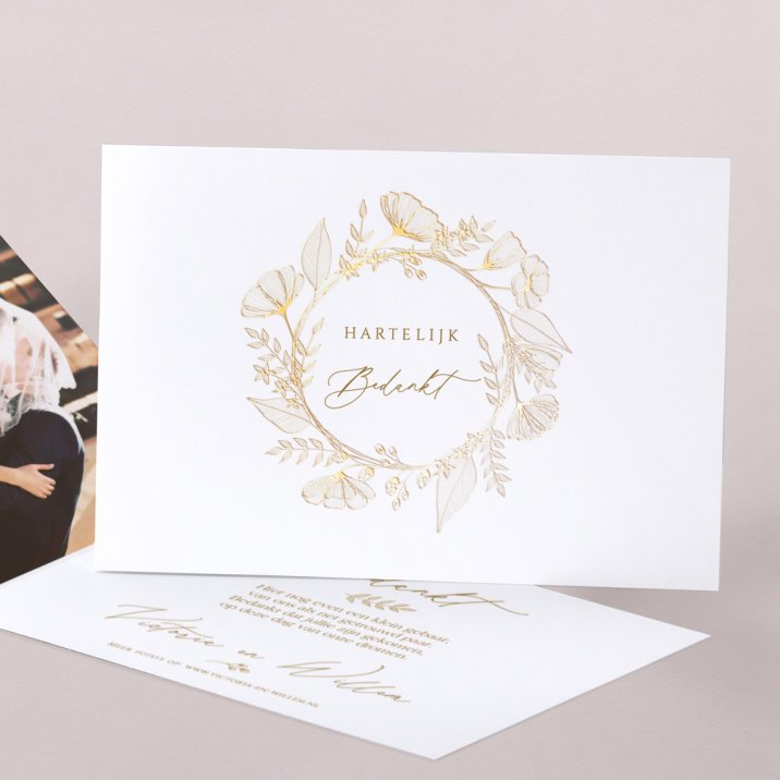 Maak met jullie mooiste trouwfoto's een onvergetelijke herinnering voor jullie en jullie naasten. Het papier van deze kaart is van hoge kwaliteit, heeft een "soft touch" effect en een fijne gouden afwerking.