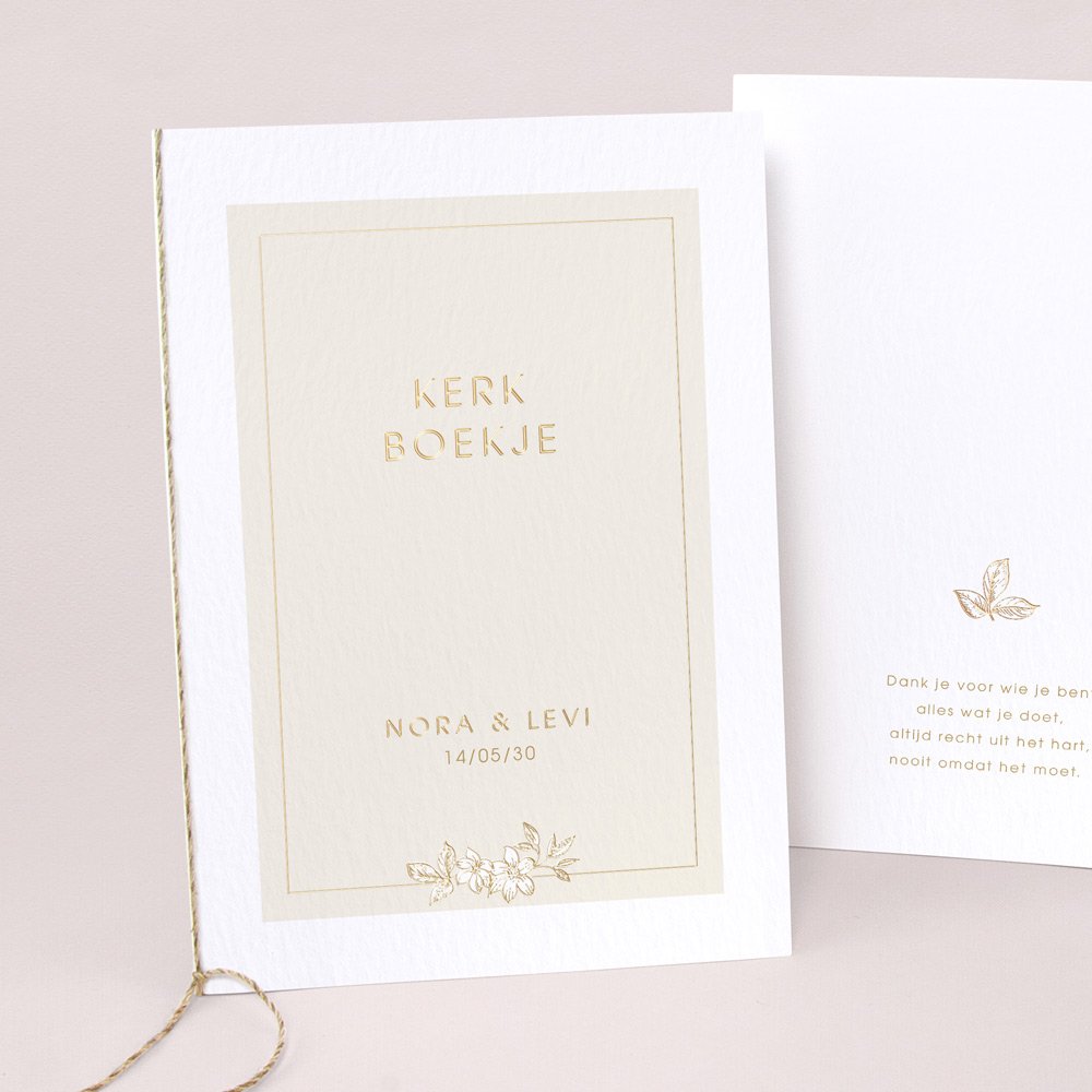 Hoesje voor jullie kerkboekje in de kleuren van jullie trouwkaart. Versierd met een lintje naar keuze (optioneel). De papieren in de binnenkant worden niet meegeleverd.