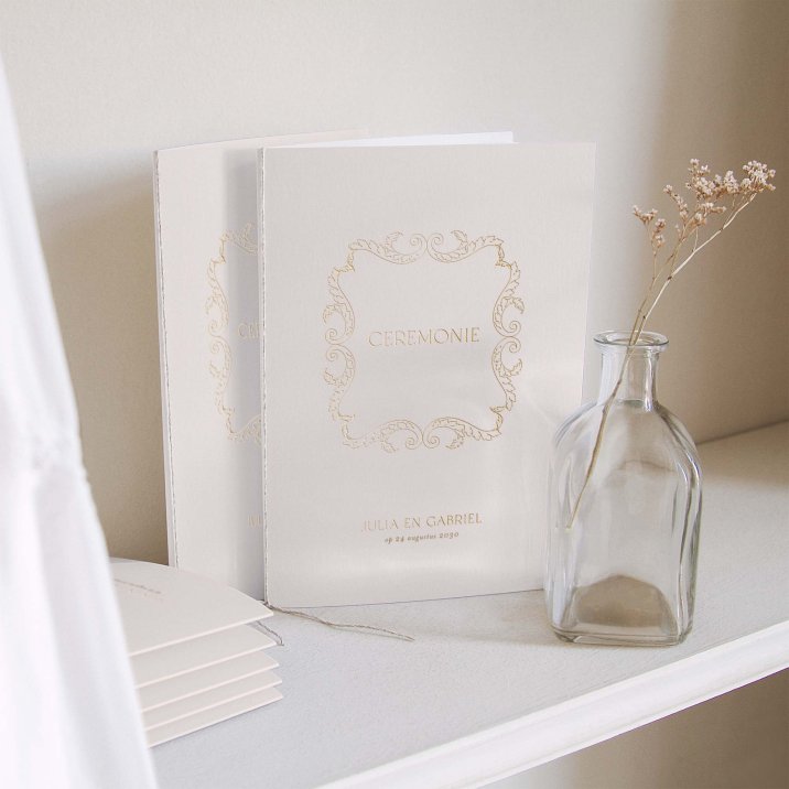 Hoesje voor jullie kerkboekje in de kleuren van jullie trouwkaart. Versierd met een lintje naar keuze (optioneel). De papieren in de binnenkant worden niet meegeleverd.