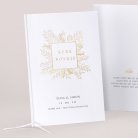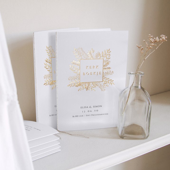 Mapje voor jullie kerkboekje of dagprogramma in dezelfde stijl als jullie trouwkaart en te versieren met een lintje naar keuze (optioneel). De papieren in het mapje worden niet meegeleverd. Het woord "Kerkboekje" krijgt een prachtig goudlaagje.