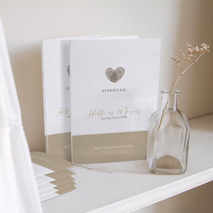Mapje voor jullie kerkboekje of dagprogramma, gemaakt van wit tekenpapier in dezelfde stijl als jullie trouwkaart en te versieren met een lintje naar keuze (optioneel). De papieren in het mapje worden niet meegeleverd.