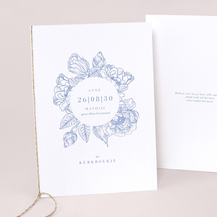 Hoesje voor jullie kerkboekje in de kleuren van jullie trouwkaart. Versierd met een lintje naar keuze (optioneel). De papieren in de binnenkant worden niet meegeleverd.