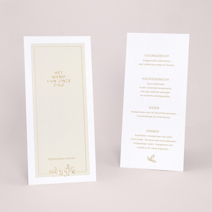 Jullie hebben het menu samengesteld voor de grote dag? Ga voor een menukaart dat bij jullie trouwkaart past!