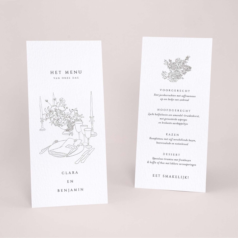Jullie hebben het menu samengesteld voor de grote dag? Ga voor een menukaart dat bij jullie trouwkaart past!