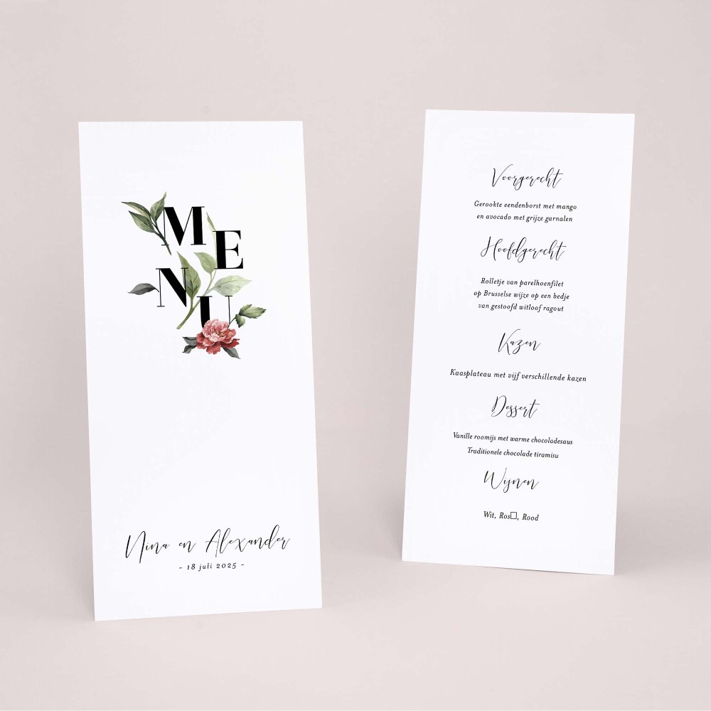 Jullie hebben het menu samengesteld voor de grote dag? Ga voor een menukaart dat bij jullie trouwkaart past!
