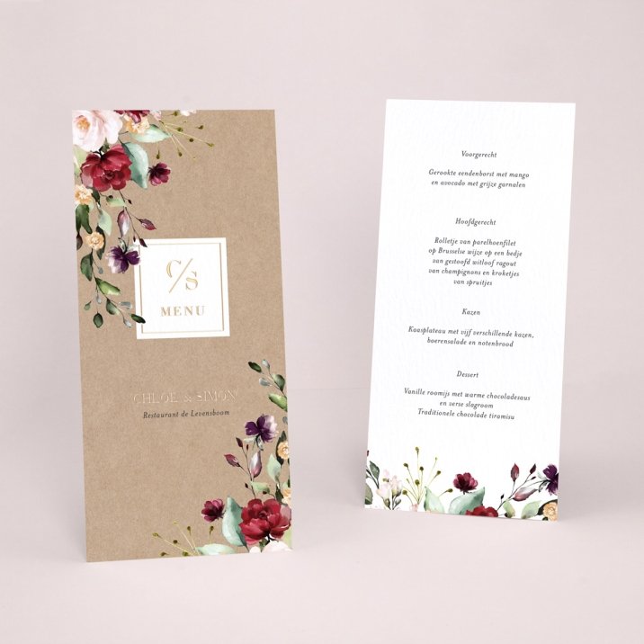 Jullie hebben het menu samengesteld voor de grote dag? Ga voor een menukaart dat bij jullie trouwkaart past!